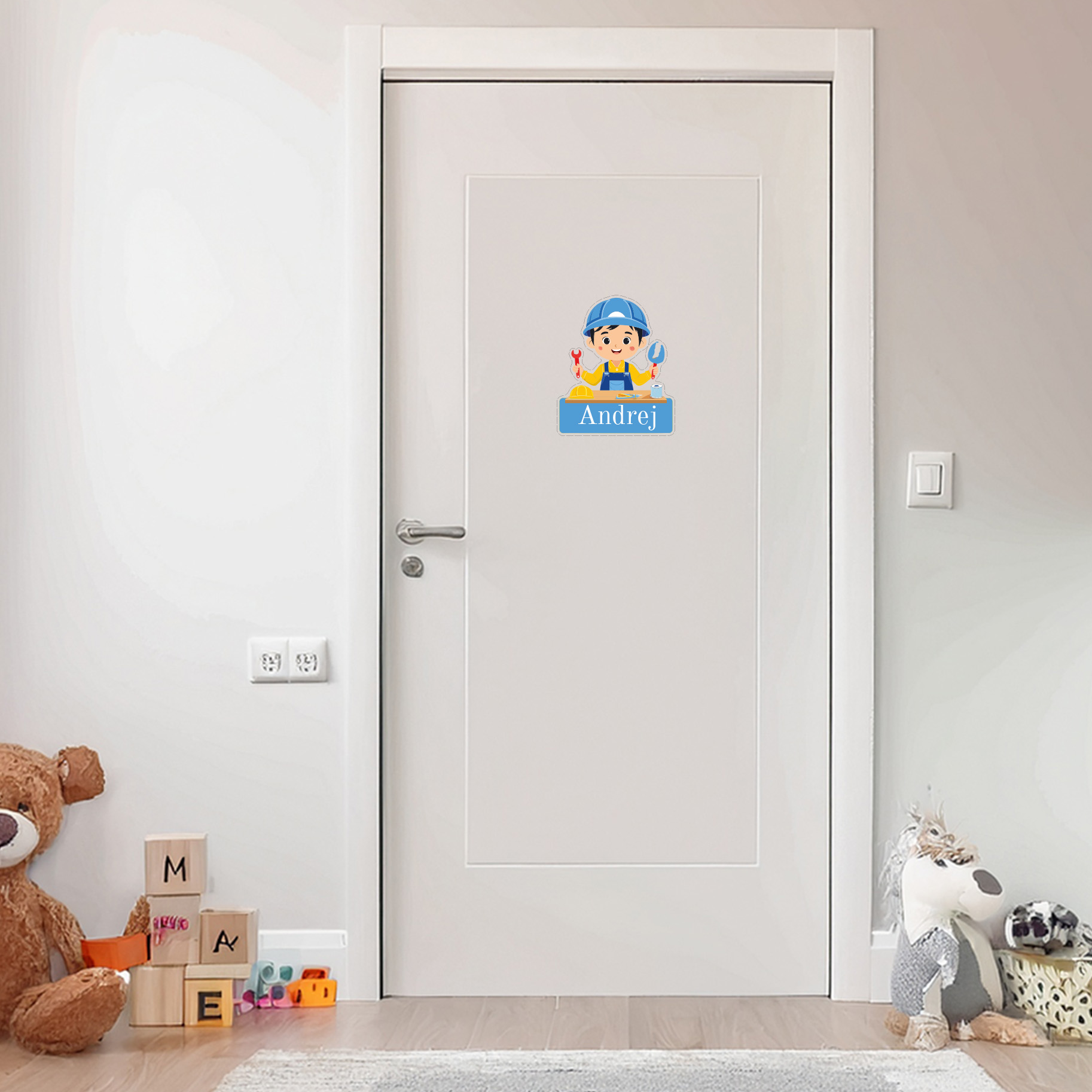 Das kindgerechte Motiv und die sorgfältigen Details sorgen für eine warme und geborgene Atmosphäre – so fühlt sich dein kleiner Heimwerker sofort zu Hause. Das praktische und dekorative Schild begleitet dein Kind viele Jahre und wird schnell zum vertrauten Lieblingsstück.